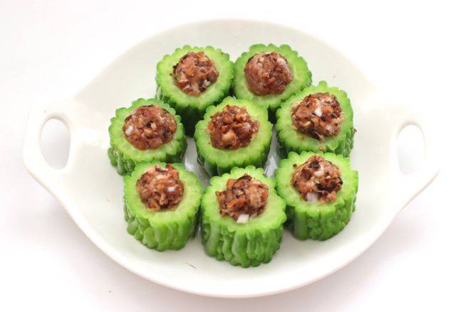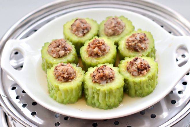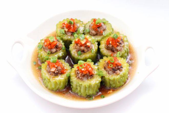 3、把調好的肉餡塞入苦瓜段中,用勺子壓緊實,放入盤中。蒸鍋加水燒開,放入苦瓜段蒸10分鐘。把盤子的湯汁倒入鍋中,加生抽、蠔油、淀粉勾芡,湯汁濃郁后澆在苦瓜釀肉上即可,撒上小米椒圈和蔥花。