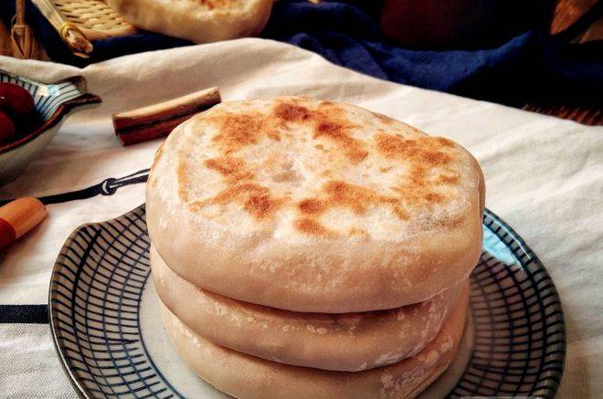3、餅皮要中間厚邊緣薄,包入一些豬肉洋蔥餡,包起來后收口,收口朝下用手按扁,用搟面杖搟成小圓餅。平底鍋倒油燒熱,放入餅胚后小火烙至兩面焦黃后即可出鍋。咬一口餅皮酥脆,內餡咸香微甜,油潤可口,汁水飽滿,口口生香。
