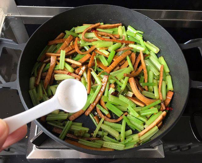 2、起鍋倒入適量油,燒熱后放入干辣椒、蔥姜爆香,倒入豆干煸炒一會兒,表面焦黃后倒入芹菜段,大火翻炒2分鐘,加入適量生抽、食鹽調味,翻炒均勻后即可出鍋。