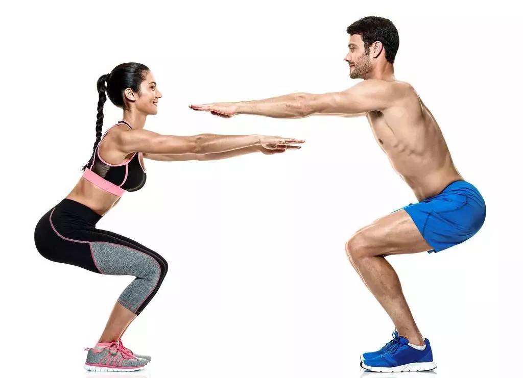 下蹲過程:背部平直后靠,臀部向后下蹲;膝關節自然彎曲到90°,膝蓋落在腳尖正上方;兩膝保持肩寬距離,目視前方。