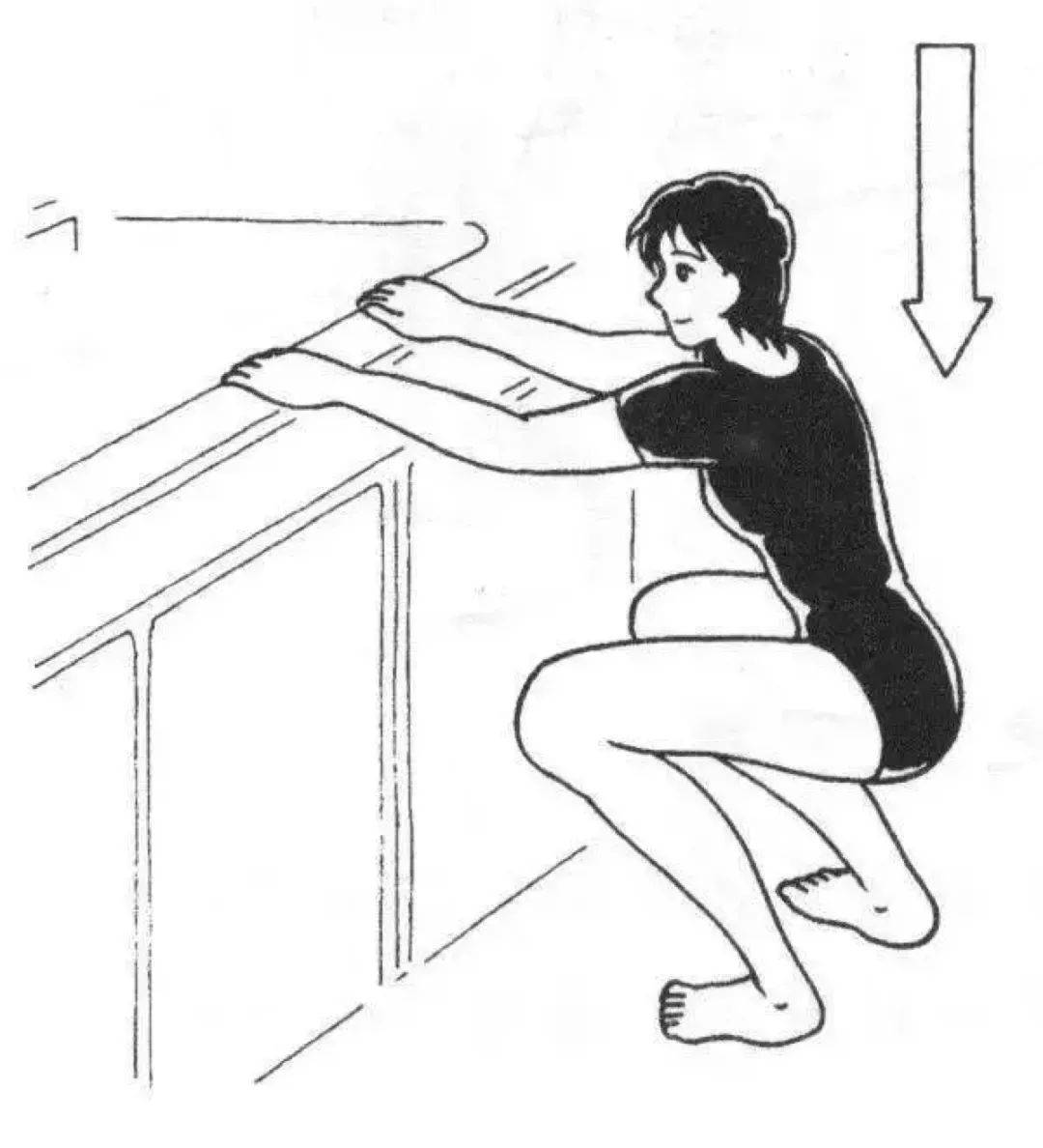 膝蓋彎曲,直到大腿與地而平行為止(視乎各人體力,老年人或初練者可先取用半蹲或1/4蹲);在完全蹲下時停頓片段最能鍛煉肌肉。
