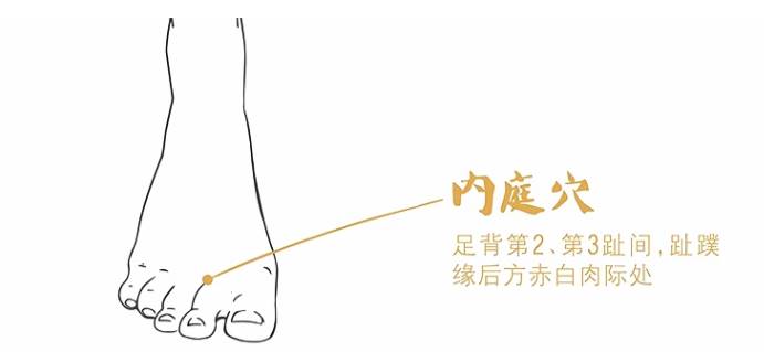 內庭穴位于足背,當2、3趾間,趾蹼緣后方赤白肉際處。屬足陽明胃經,可清胃瀉火,理氣止痛。